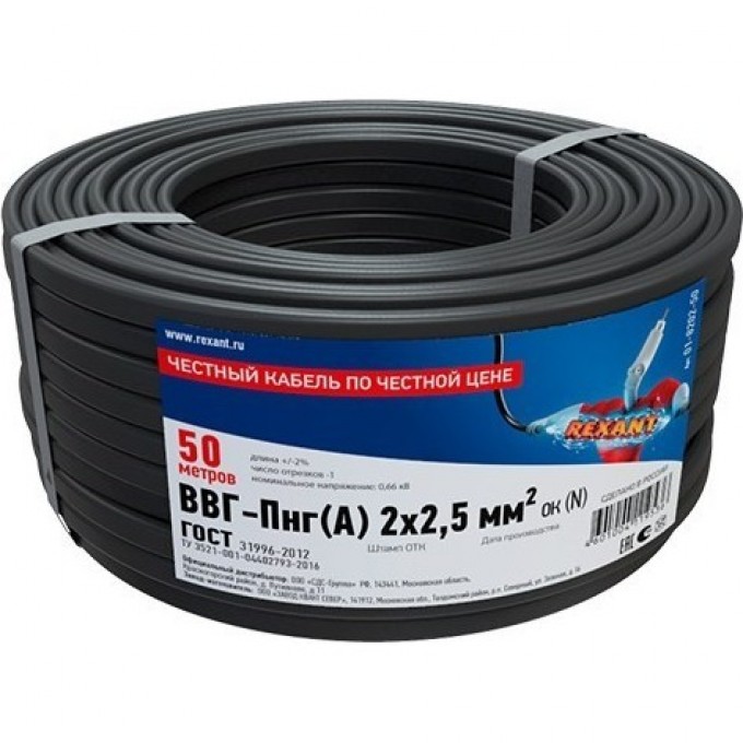 Кабель силовой медный REXANT ВВГ-Пнг(А) 2x2,5 мм², 50 м, ГОСТ 31996-2012, ТУ 16-705.499-2010 01-8202-50